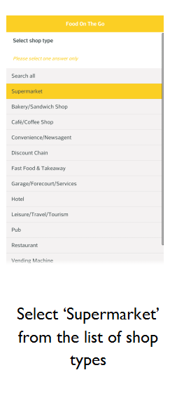 To start the process, select 'Food On The Go' from the first screen that you see when you open the app. Then, from the list of shop types on the following screen, please select the type of shop at which you bought your snack, drink or meal. If you are unsure, select 'Search All'.